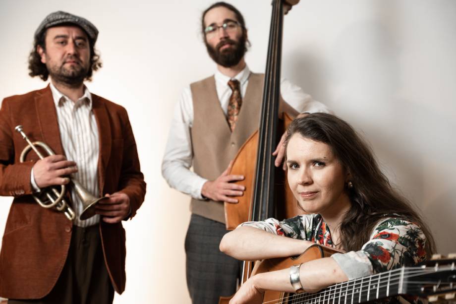 Die wohl feinste Jazzband im Pocketformat. Passt in jede Umkleidekabine, Wohnzimmerecke, Büronische oder Wedding-Brieftasche. Diese lustige Swingband besteht aus 3 charismatischen Jazzmusikern: Trompeter Vova Navozenko, mit seinem kuscheligen Bart, der großartig mit Hut aussieht, Sängerin Svitlana Varava, die Gypsy-Gitarristin mit der umwerfenden Stimme und der groovigsten und swingendsten Kontrabassisten Tobias Steinrück. Die Besetzung passt perfekt zur Firmeneröffnung, Gartenparty oder zum stilvollen Hochzeitsfest.
